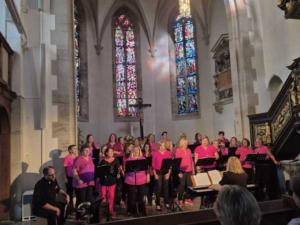 Aufgrund unserer sehr kurzfristigen Zusage zur Teilnahme und der wenigen Probezeit sind wir ohne große Erwartungen, sondern mit dem Fokus Dabeisein und Spaß am Chorgesang haben und eine neue Erfahrung machen nach Gochsen gestartet.